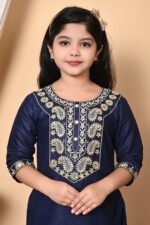 Elevate your little one’s festive look with this stunning dark green embroidered kurti and pant set. Designed with intricate golden thread embroidery on the neckline and hemline, this outfit reflects timeless traditional elegance.