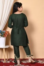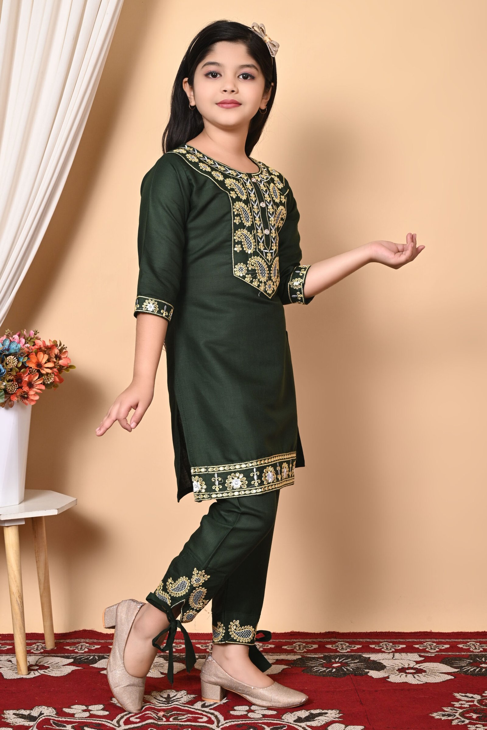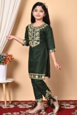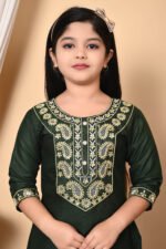 Elevate your little one’s festive look with this stunning dark green embroidered kurti and pant set. Designed with intricate golden thread embroidery on the neckline and hemline, this outfit reflects timeless traditional elegance.